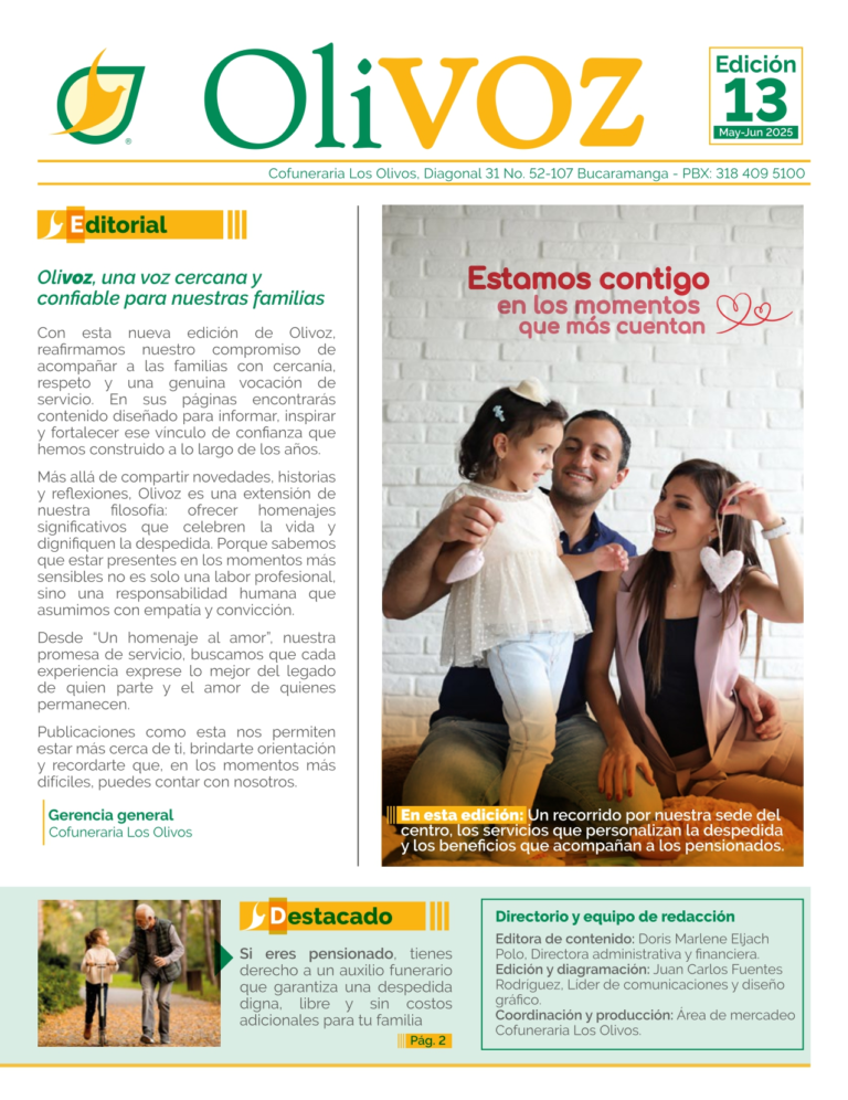Descubre en esta edición de Olivoz cómo te acompañamos en los momentos importantes. Recorre con nosotros nuestra sede del centro de Bucaramanga, conoce nuestros servicios para personalizar despedidas únicas e infórmate sobre el auxilio funerario para pensionados. Olivoz, siempre cerca de ti con información relevante y de confianza.