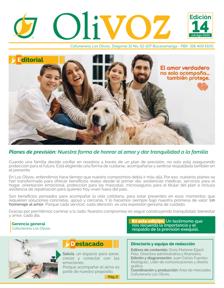 En esta edición: nuestros planes de previsión, una forma de proteger a quienes más amas. Salvia, nuestra iniciativa de cuidado emocional. Conoce una historia conmovedora que muestra cómo una decisión puede hacer más llevadero el adiós. Recorre nuestra sede en Piedecuesta, un espacio que refleja nuestro compromiso por honrar la vida con respeto y calidez.
